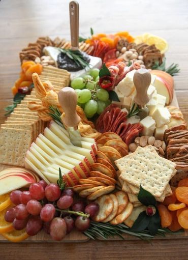 Quesos, jamones, frutas , galletas, panes y otros de manera muy hermosa y atractiva. Tu mesa lucirá hermosa.